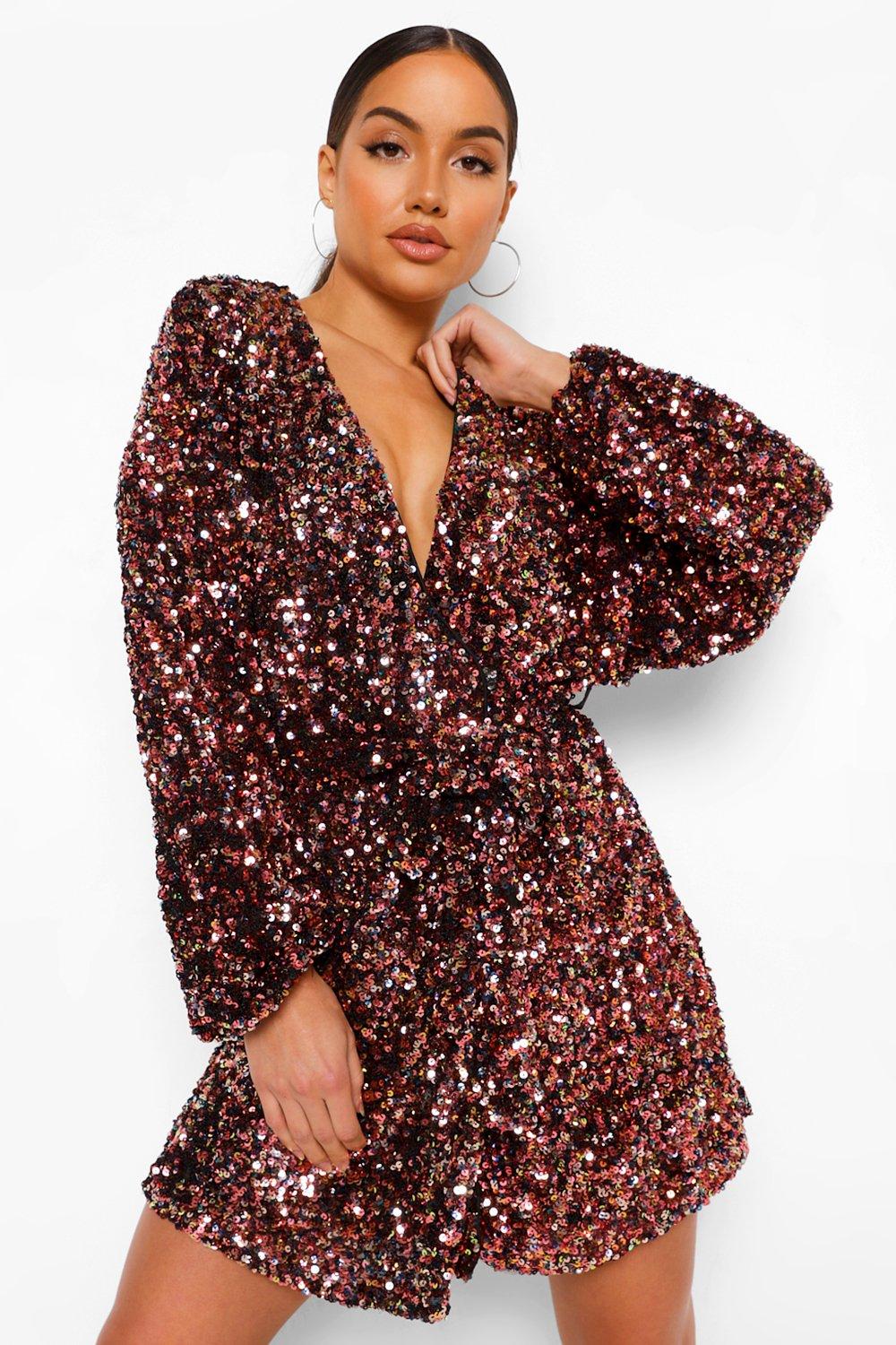 Robe cache-cœur courte à paillettes et manches longues | boohoo